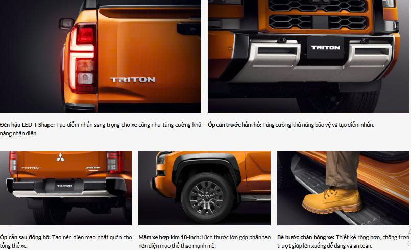 All-New Triton với thiết kế phần ngoại thất hoàn toàn thay đổi, được nhà sản xuất lấy cảm hứng từ ý tưởng “Beast Mode” – mạnh mẽ, hầm hố nhưng không kém phần thể thao. Lưới tản nhiệt được tinh chỉnh thiết kế dạng tổ ong cỡ lớn kết hợp cùng cản trước vuông vức, tạo ấn tượng mạnh mẽ ngay từ cái nhìn đầu tiên. Ốp cản sau đồng bộ, tạo điểm nhấn thể thao cho tổng thể xe. Hệ thống đèn chiếu sáng LED Projector hình chữ T hiện đại, tích hợp dải đèn định vị ban ngày LED hình chữ L, không chỉ tăng tính thẩm mỹ mà còn cải thiện khả năng chiếu sáng, tối ưu tầm nhìn cho người lái.