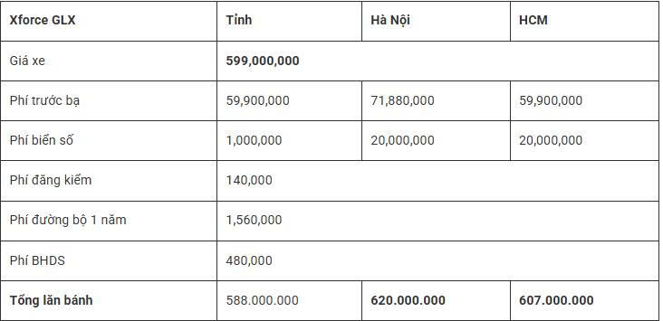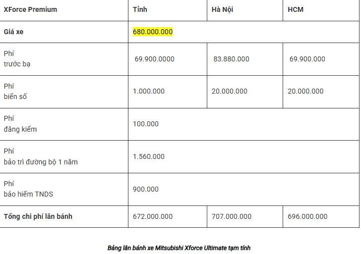 Chi phí lăn bánh của xe Mitsubishi Xforce còn tùy thuộc vào khu vực bạn đang ở và chi phí mua xe qua bank hay tiền mặt : Chương trình khuyến mãi giảm giá của đại lý và nhà máy Mitsubishi, thuế trước bạ và phí biển số của từng địa phương. Hiện tại để khách hàng dễ hình dùng chúng tôi sẽ tạm tính theo mức giá bán niêm yết như sau: